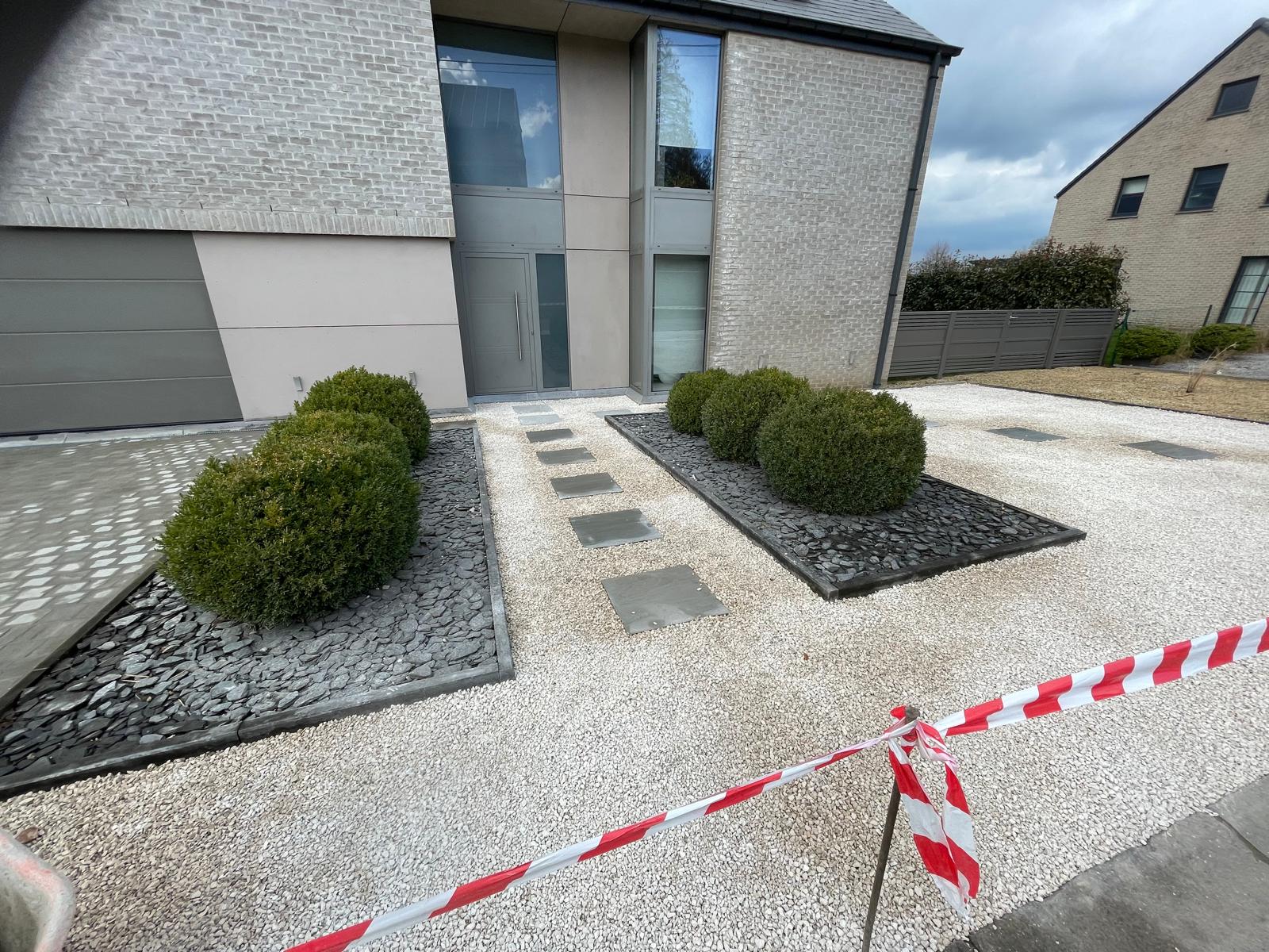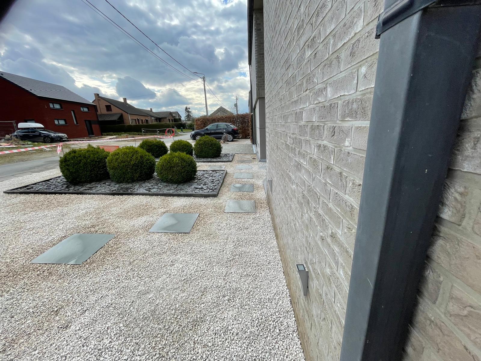 Nous avons ensuite posé des dalles en grès de couleur grey au format 60x60x3/4 cm, apportant une touche élégante et naturelle pour l’accès à la porte d’entrée de l’habiation. Pour compléter cet espace, des pavés kandlas en grès grey de 14x14x5/7 cm ont été installés devant le garage, alliant solidité et charme intemporel. Ces matériaux de haute qualité s’intègrent parfaitement aux aménagements extérieurs tout en garantissant une excellente résistance aux conditions climatiques.