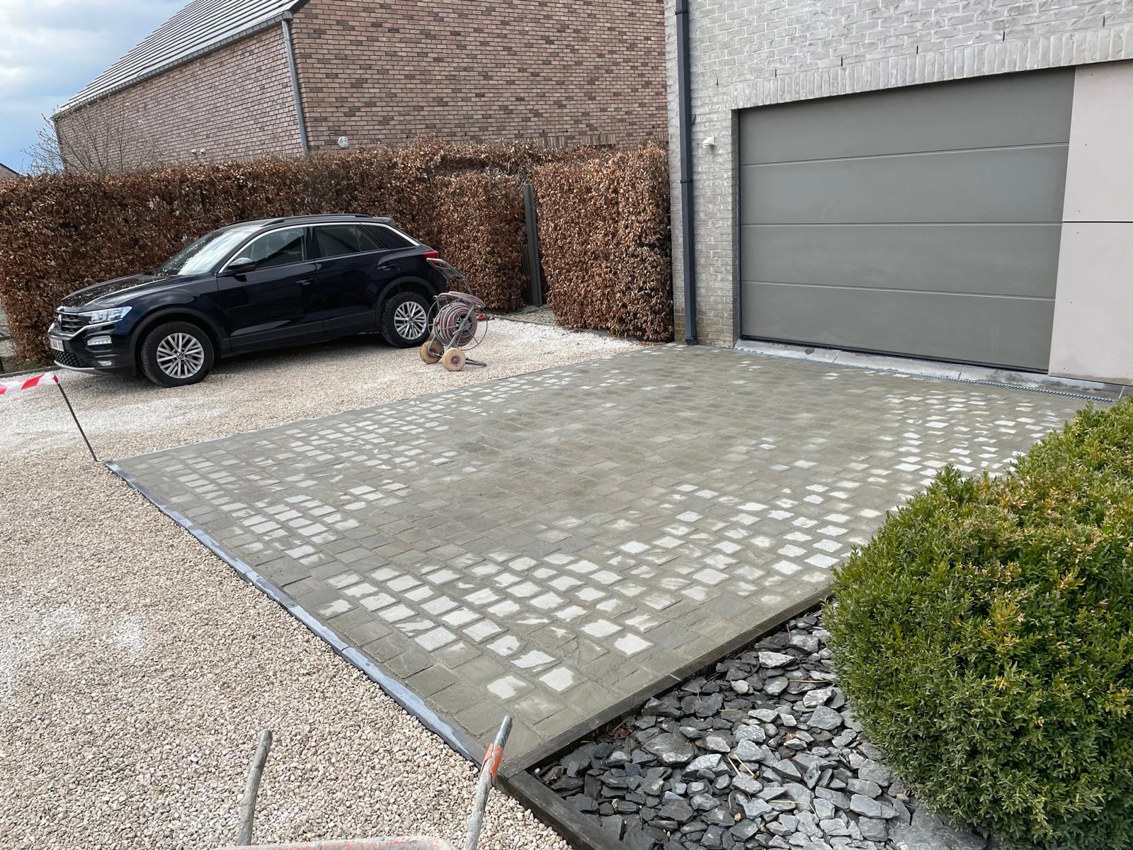 Enfin, pour une finition soignée et une structuration harmonieuse des différentes zones, nous avons installé des bordures en pierre bleue autour de l’espace pavé. Ces éléments de délimitation assurent non seulement une cohésion esthétique, mais aussi une meilleure tenue du pavage dans le temps.