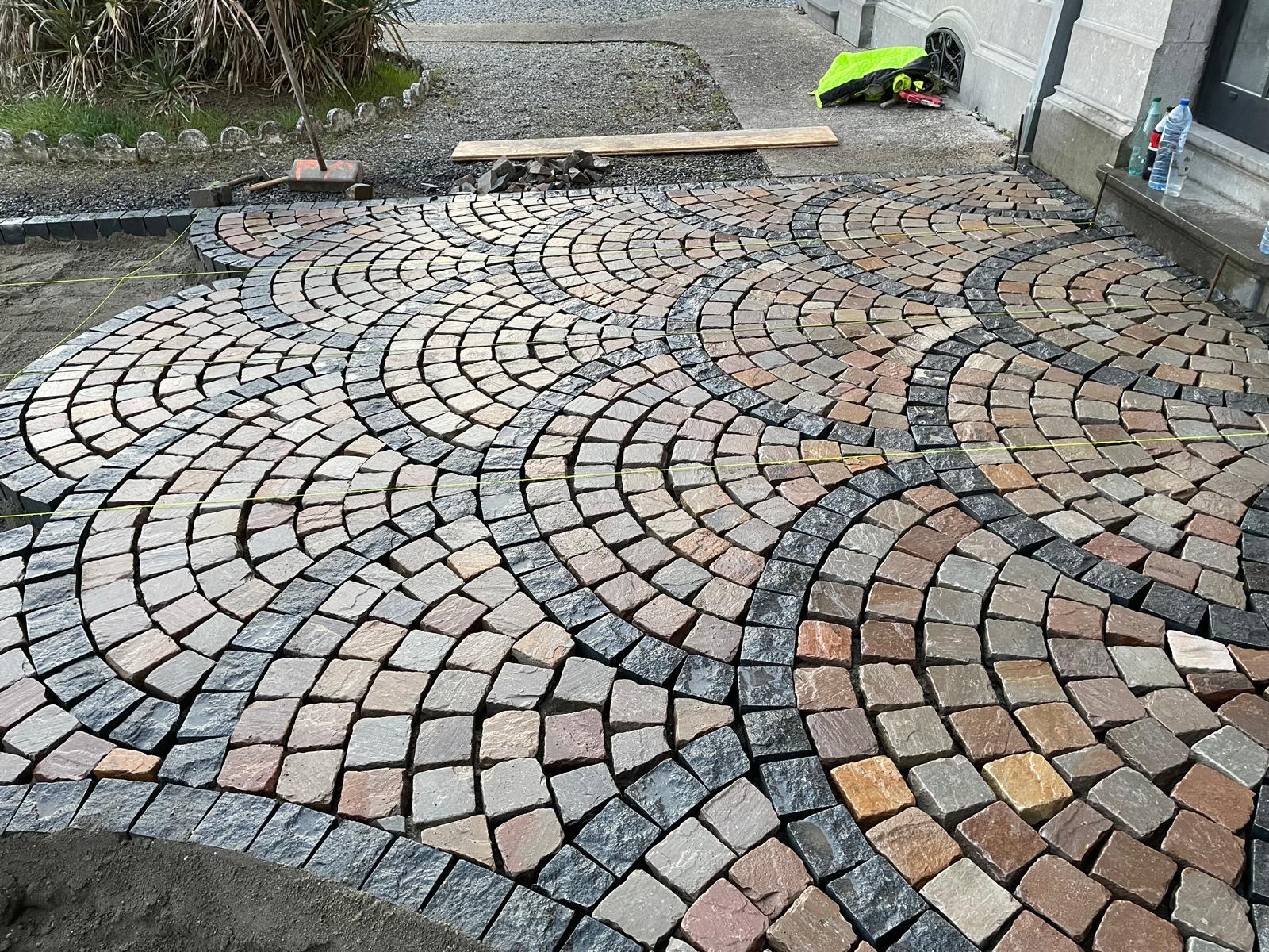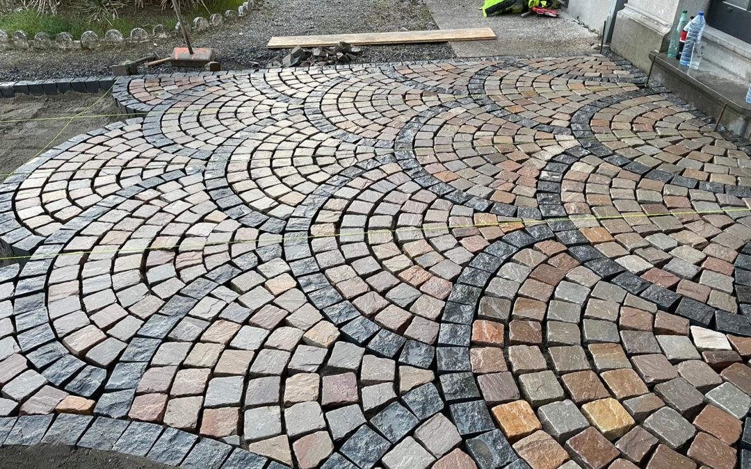 La zone a été entièrement pavée avec des pavés en grès kandlas multicolores au format 10x10x5/7 cm, reconnus pour leur résistance aux intempéries et leur esthétique naturelle. La pose en mosaïque permet ici de créer un motif visuel vivant, mettant en relief les nuances naturelles du grès tout en assurant une durabilité exceptionnelle pour cette surface à fort passage.