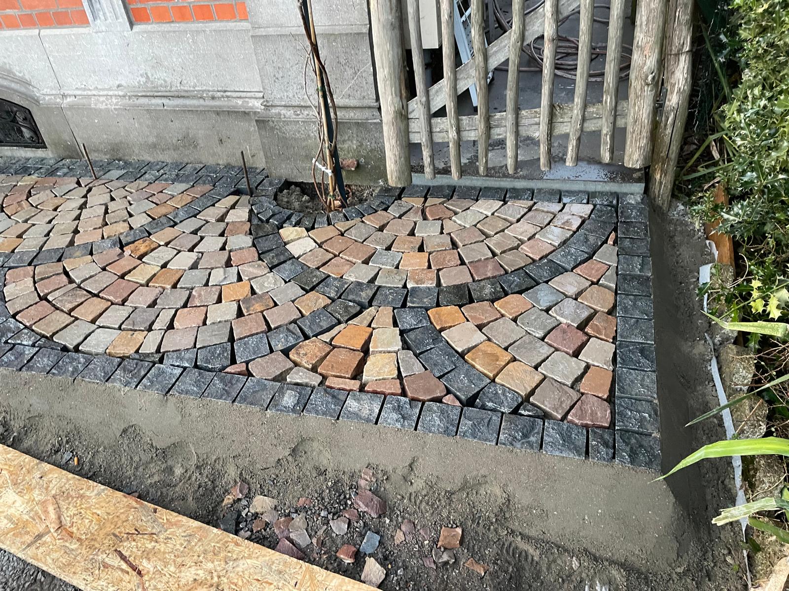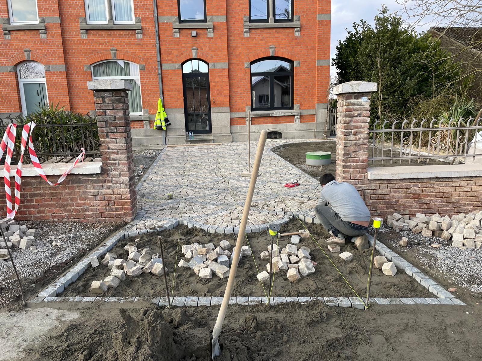 En avril 2025, Ligne Extérieure a réalisé un aménagement de pavage soigné sur la devanture d’une maison à Fosse-la-Ville, dans la province de Namur. Cet aménagement extérieur de 60 m² met en valeur l’utilisation de pierre naturelle et de techniques artisanales, avec un accent particulier sur la pose en mosaïque de pavés de qualité.