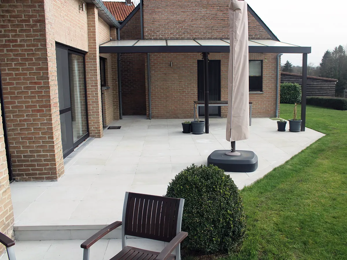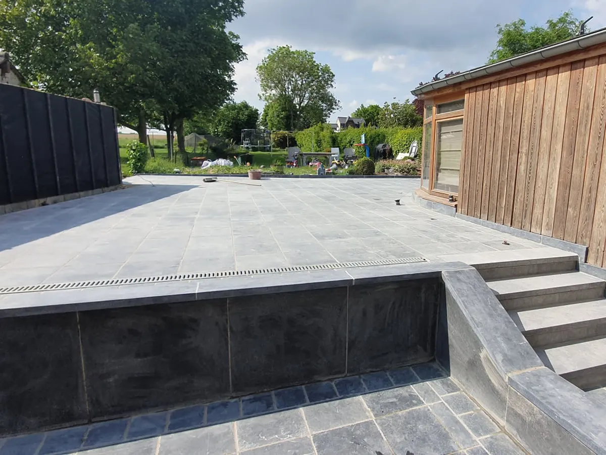 Terrasse en dalles de pierre bleue belge adoucie 60x40x3 cm posées au traditionnel à Namur. Joints hydrofuges sans retrait pour une finition durable.