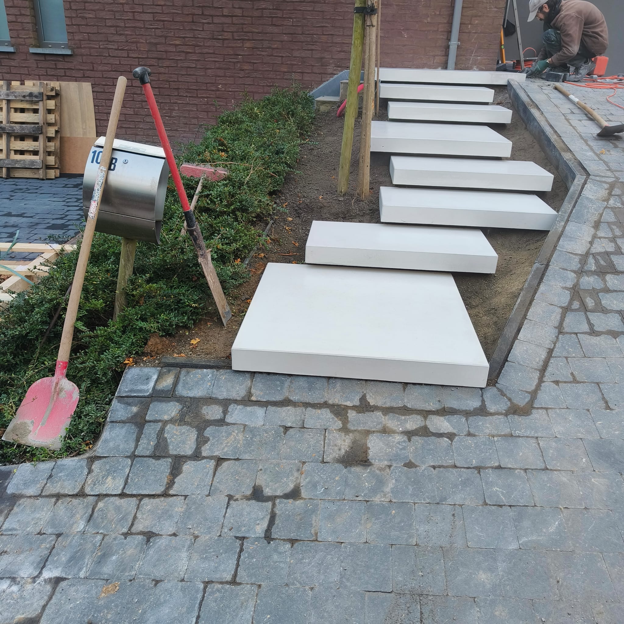 Pour faciliter l’accès à l’habitation, nous avons mis en place un escalier en mégadalles Smooth de chez Ebema, combinant différentes dimensions :