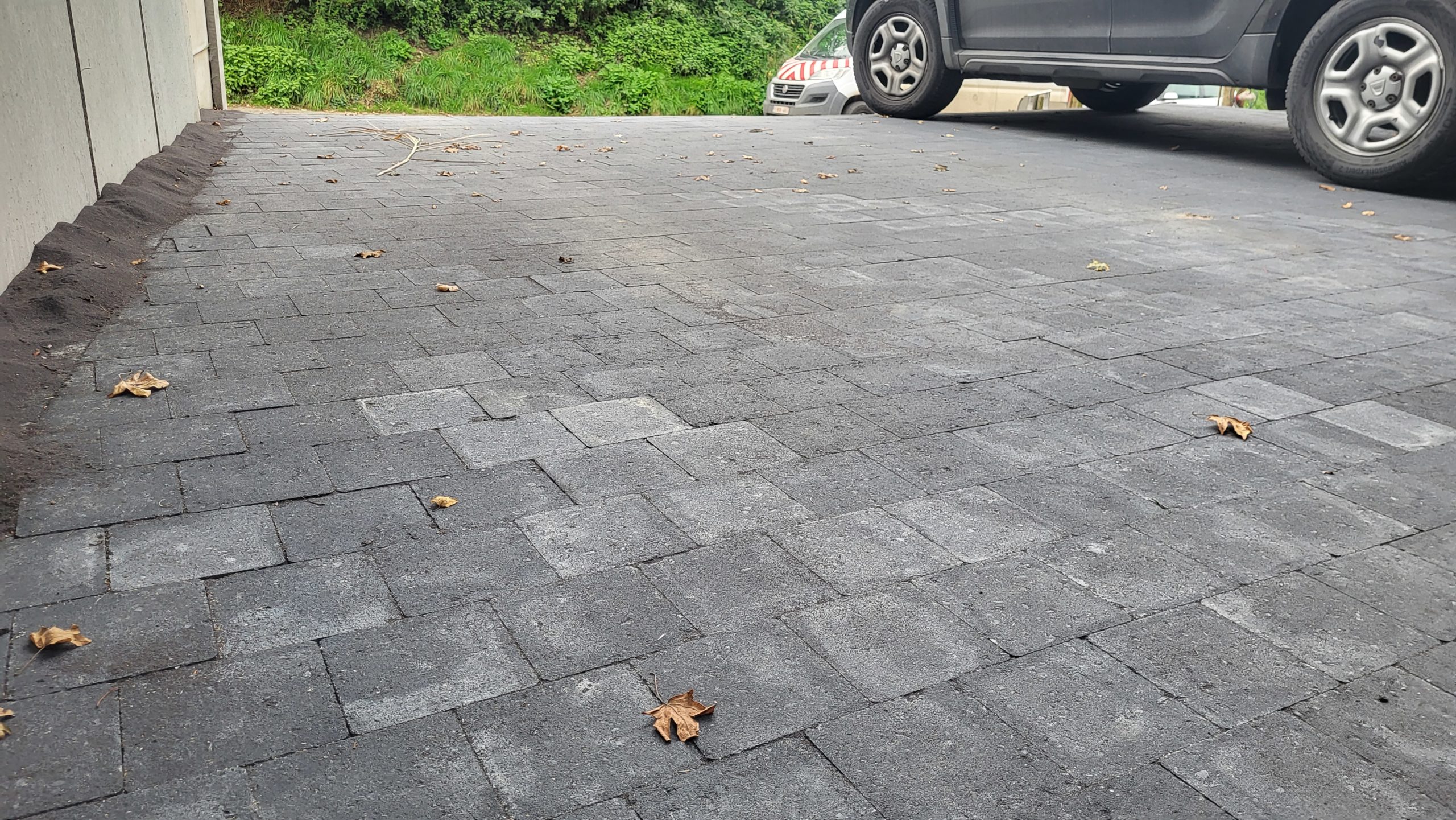 Pour sublimer le pavage et garantir sa perméabilité aux eaux de pluie, les joints ont été soigneusement remplis avec du sable fin noir. Ce détail donne une touche originale au parking tout en respectant les contraintes environnementales.