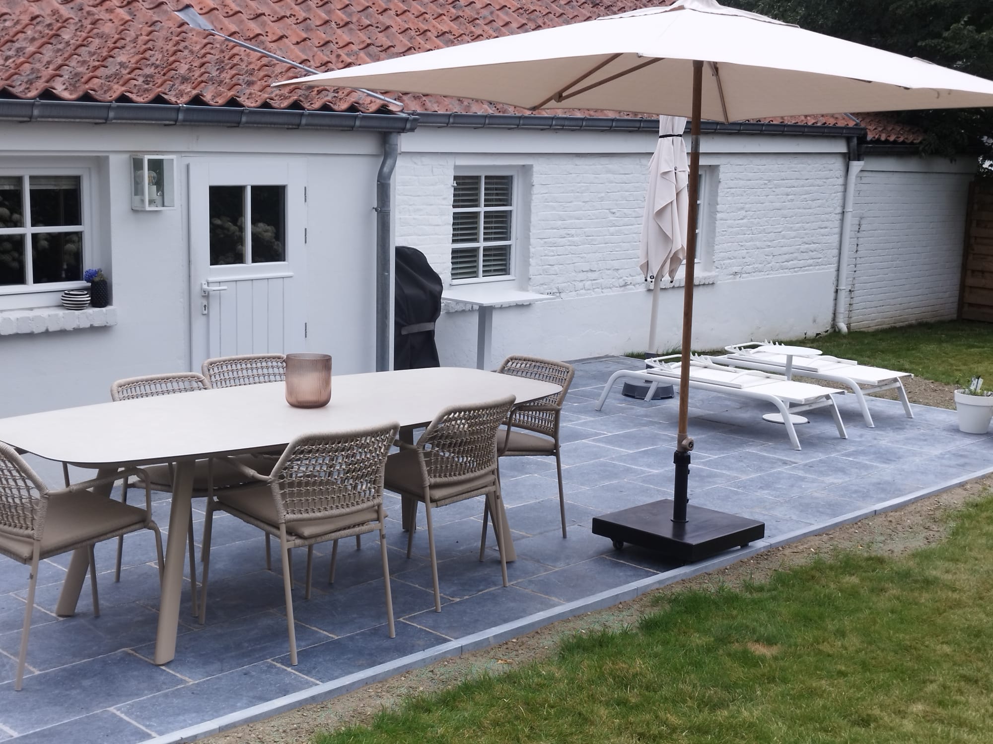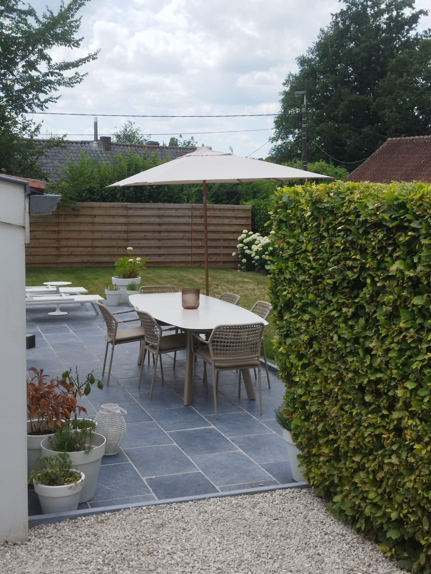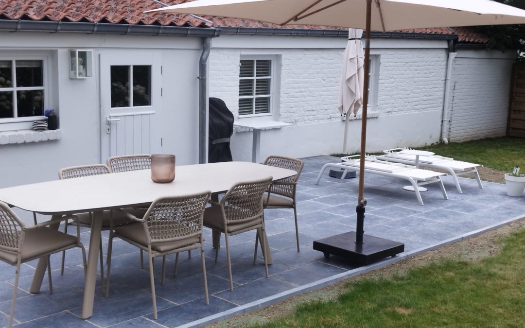 Afin de structurer harmonieusement les abords de la terrasse et d’en assurer la tenue dans le temps, nous avons installé des bordures en pierre bleue grésée de 100x20x6 cm, parfaitement intégrées à l’ensemble. Ce type de bordures en pierre naturelle est essentiel pour préserver la forme du dallage au fil des saisons.