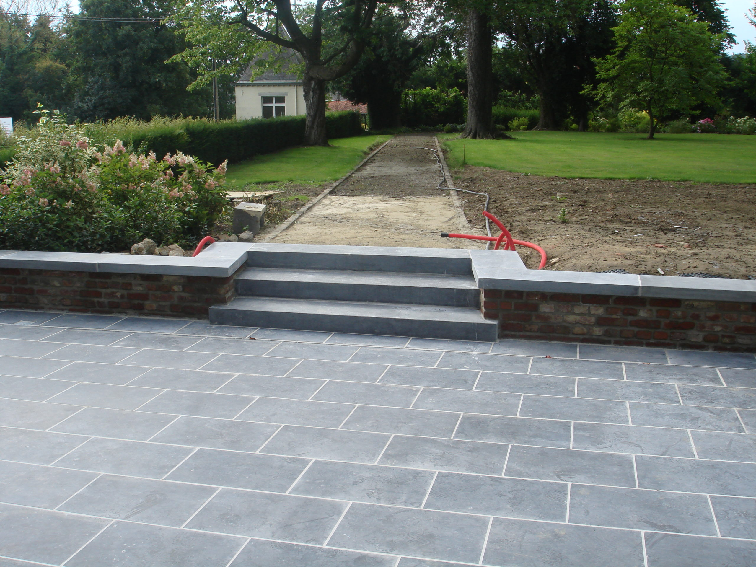 Cet aménagement extérieur illustre parfaitement la valeur ajoutée de la pierre naturelle dans les projets de pavage et de dallage en Wallonie. Alliant esthétique, confort et robustesse, la pierre bleue belge reste un choix de référence pour les terrasses, allées et espaces extérieurs.